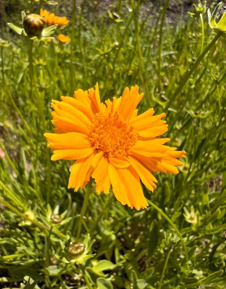 Lancele-leafed coreposis, sometimes known as "tickseed", is a North America native prairie plant that is known for attracting pollinating species. Coreopsis is easy to grow and thrives best in full sun and well draining soil. It grows very well in pots and in garden settings. It tolerates drought, but will flower and grow more profusely in damp soil.