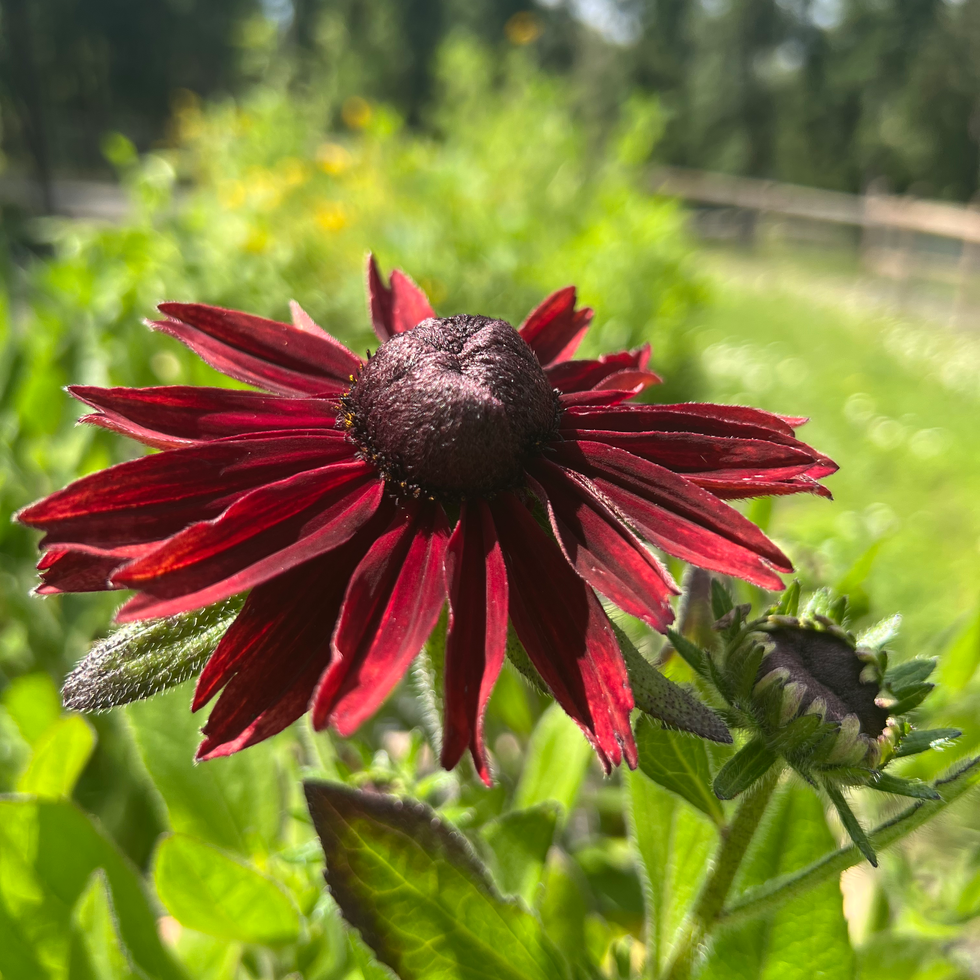 Rudbeckia hirta 'Cherry Brandy' is a cultivar with red to maroon blooms surrounding dark center cones. Plants will reach up to 24" tall and 16" wide. The flowers bloom continuously from mid-summer into fall. Blooms best with mulching and rich soil. The flowers are on sturdy stems which makes them excellent cut flowers. Cherry Brandy is a perennial that blooms in its first year, but may be treated as an annual.